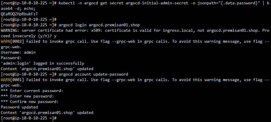argocd 를 사용하기 위한 기본 계정은 admin 이며, 비밀번호는 랜덤으로 부여됩니다. 웹 접속을 위해 초기 비밀번호를 확인하고 새로운 비밀번호를 설정합니다. 초기 비밀번호를 확인하고 변경하는 작업은 argocd CLI를 통해 진행합니다.
