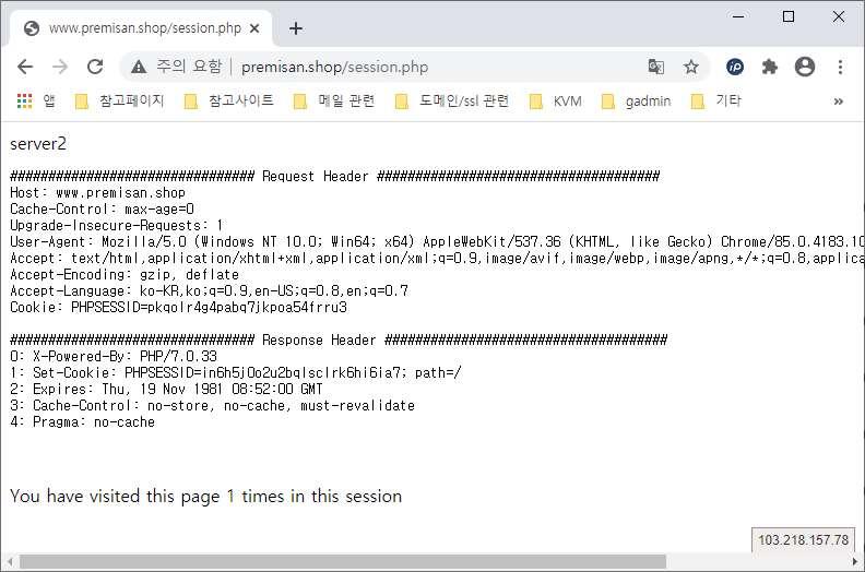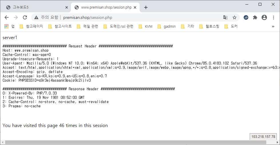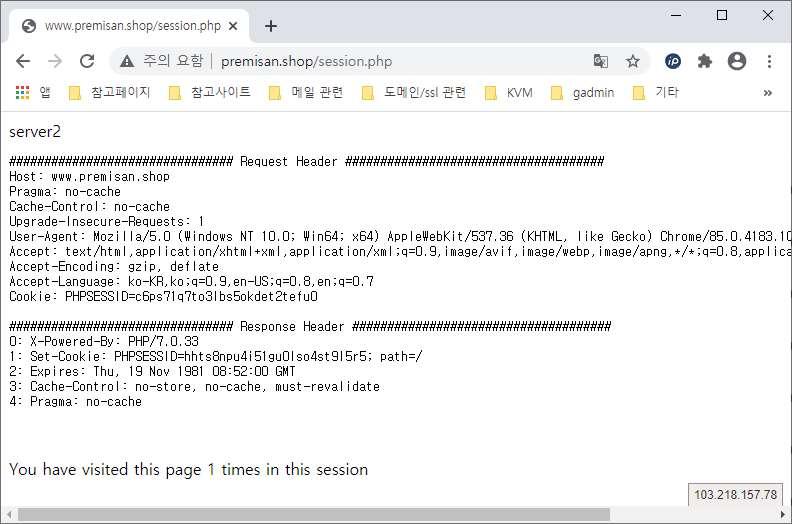 세션 클러스터링 후 동일하게 클라이언트와 서버가 어떤 쿠키를 주고 받는지 확인합니다. 아래와 같이 동일한 쿠키(PHPSESSID=q9r3ej4asaank9pajp9c2ijlv3)를 통해 웹서버1과 웹서버2에 정상적으로 접속이 되는 것을 확인할 수 있습니다.
