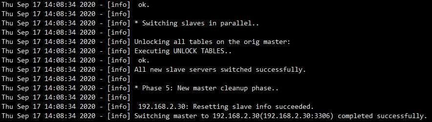 Thu Sep 17 13:37:16 2020 - [info] All other slaves should start replication from here. Statement should be: CHANGE MASTER TO MASTER_HOST='192.168.2.40',