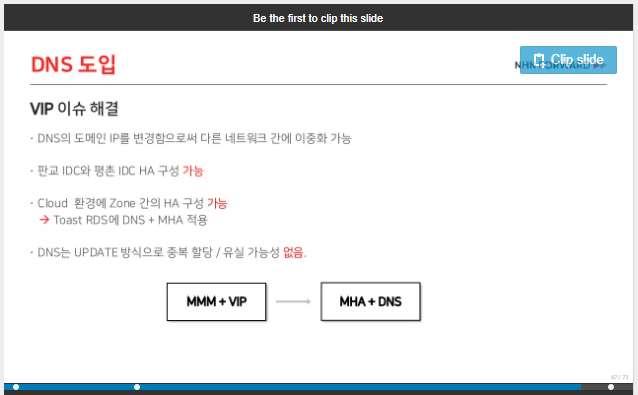 NHN에서 2018년 진행한 온라인 컨퍼런스의 자료를 참고하면 Toast RDS에 MHA와 DNS(CNAME을 이용한 연결 방식)을 적용하여 HA 구성을 하였다는 내용을 확인할 수 있습니다.