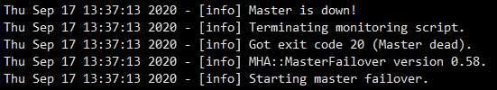 이후 MHA 매니저는 모니터링 스크립트를 종료하며, 자동으로 장애조치 단계로 넘어갑니다.