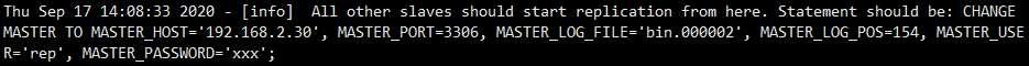 grep "All other slaves should start replication from here" /var/log/masterha/MHA.log