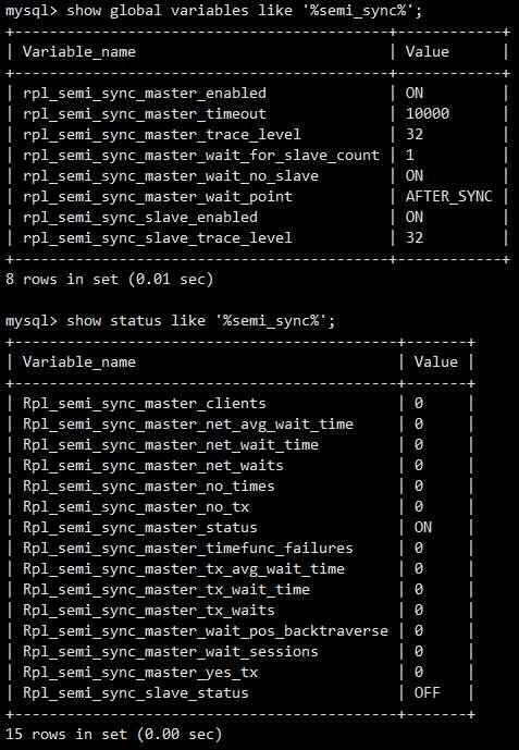 show status like '%semi_sync%';설정값 및 상태 확인의 결과는 아래와 같이 보여집니다.