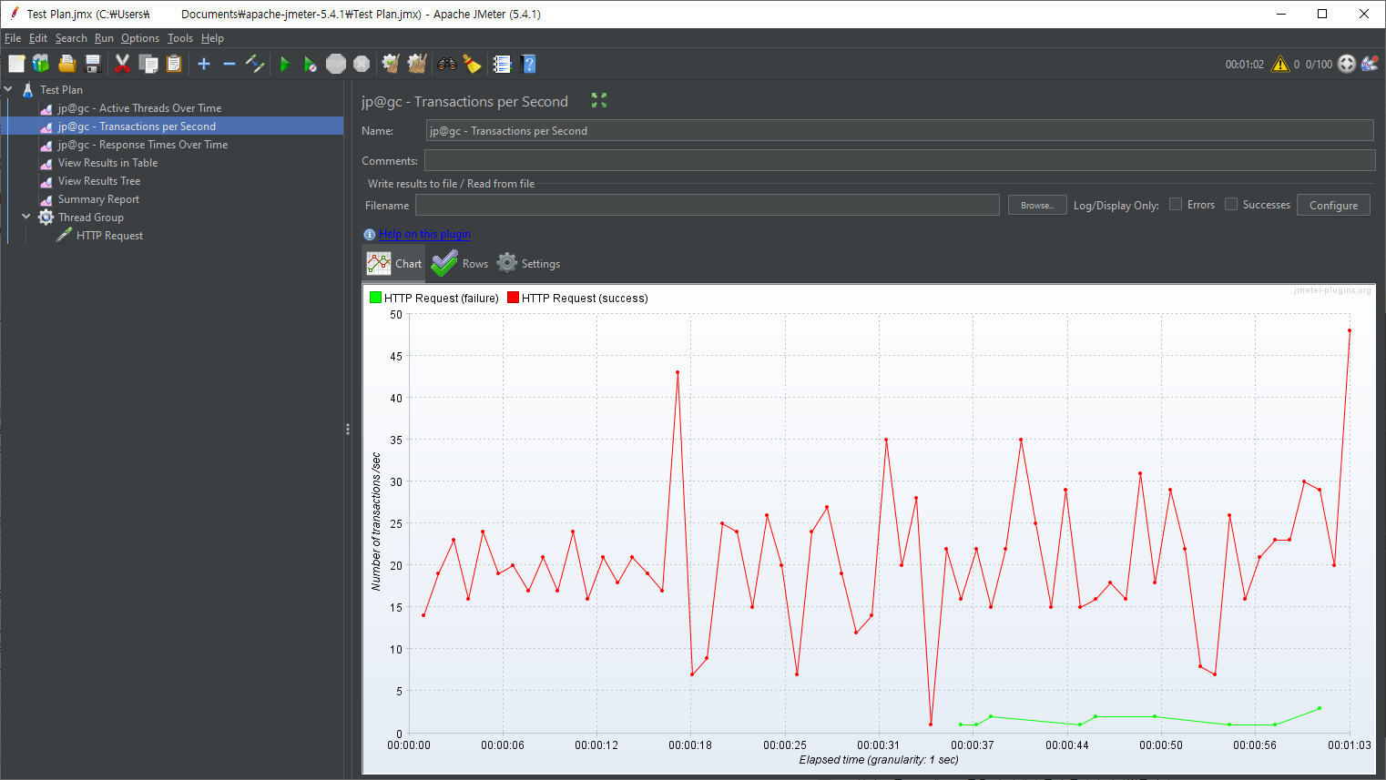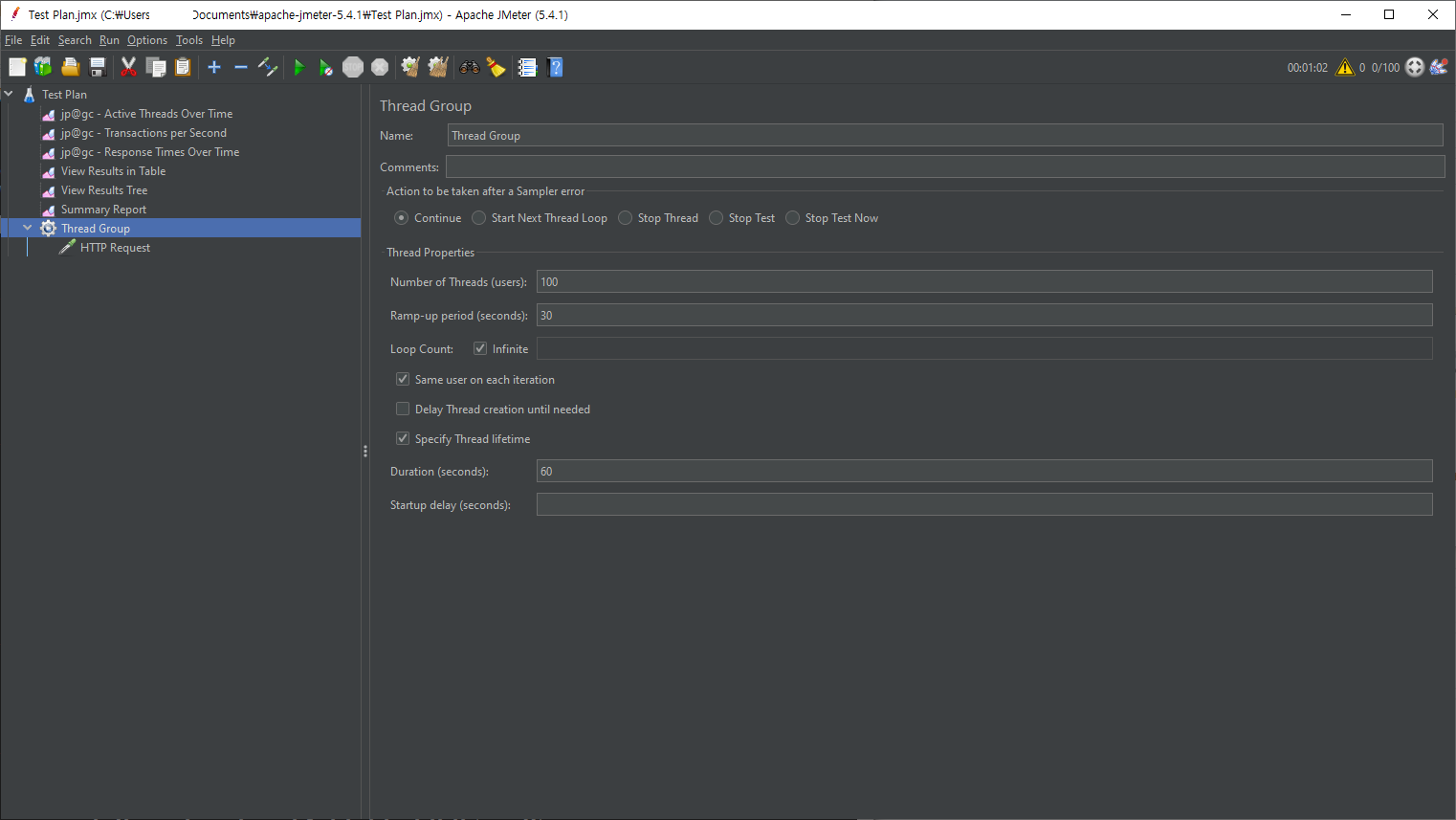 jmeter 에서 위의 설정과 가능하면 동일한 조건으로 테스트를 진행해봤습니다. 60초에 걸쳐 100개의 가상 사용자를 생성하고 30초의 Ramp-Up 기간을 줬습니다. 커넥션 및 응답 타임 아웃은 5초로 각각 지정했습니다.