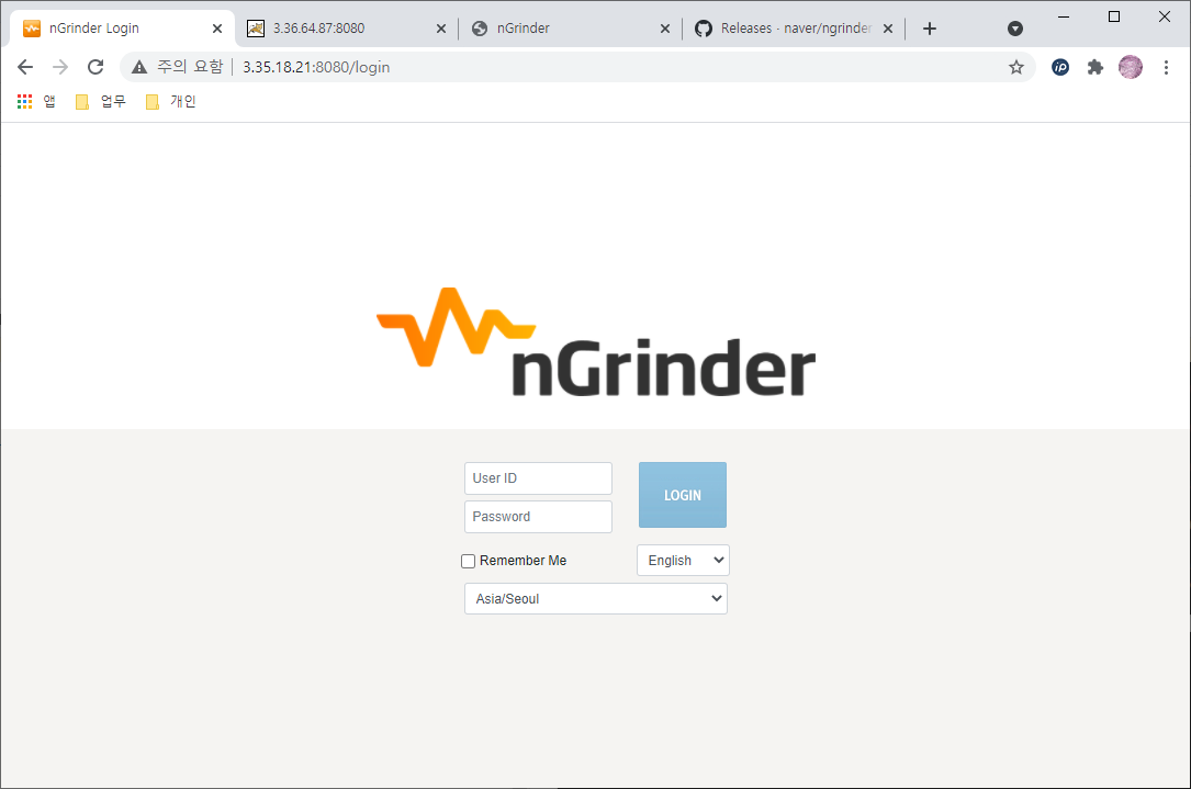 이렇게 실행이 완료되면 8080포트를 통해 웹으로 접속합니다. 네이버에서 만들었기 때문에 한국어도 지원합니다. 초기 아이디/비밀번호는 admin/admin 입니다. 로그인 후 적절하게 변경합니다.