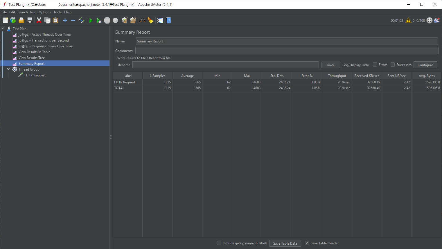 위의 조건으로 테스트 진행 시 아래와 같이 결과가 나타났습니다. ngrinder를 통해 부하 테스트했을 때와 동일하게 초당 약 20의 트랜잭션을 처리하는 것을 확인할 수 있습니다. Summary Report 에서 보여지는 Troughput(처리량=TPS)도 20.9/sec 을 확인할 수 있습니다. 에러율의 경우에도 약 1%로 nginder 에서의 에러율과 거의 같습니다.(에러 수(10) / 총 테스트 수(954) = 약 1%)
