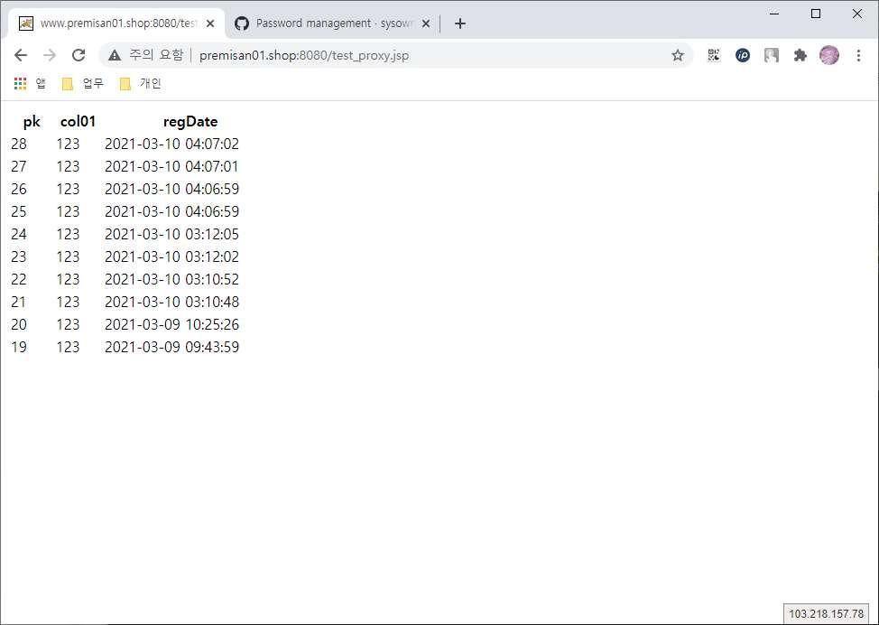 웹을 통해 접속하여 테스트 진행합니다. 정상적으로 SELECT 결과를 가져온 것을 확인할 수 있습니다.