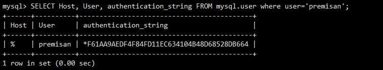 먼저 원본 DB에서 premisan 유저의 암호화된 비밀번호를 확인합니다.