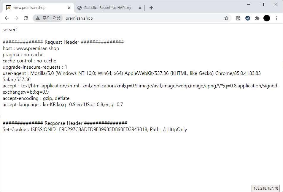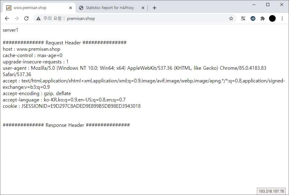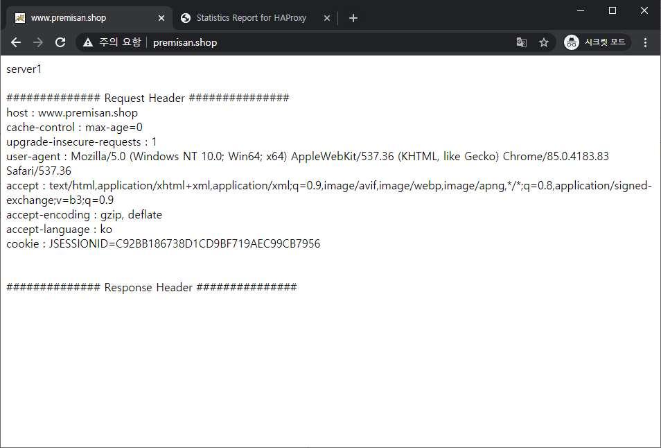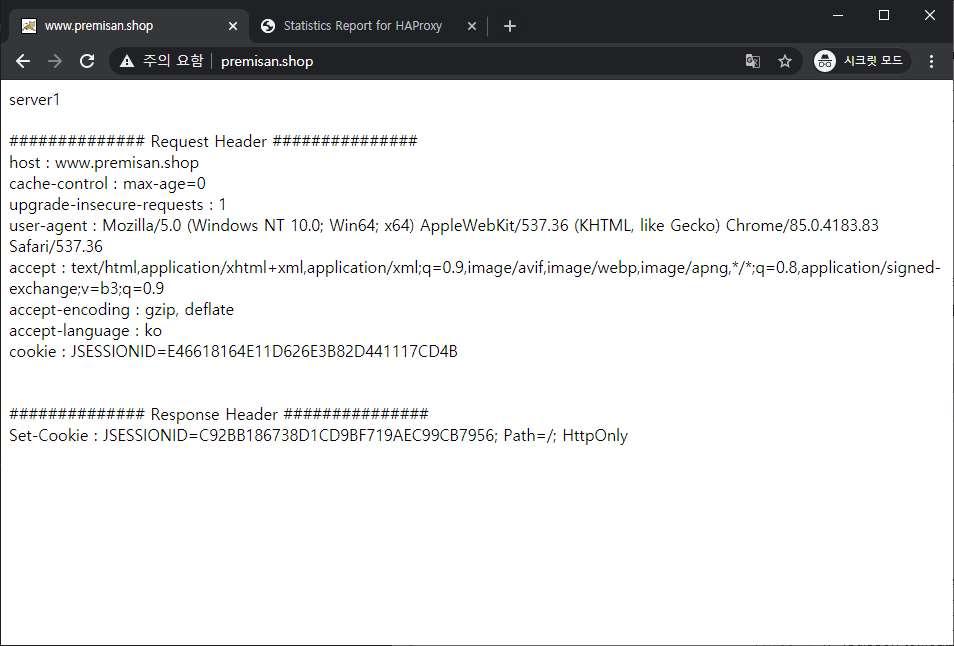 여러번 페이지를 새로고침하여 기존 저장한 쿠키 값(C92BB186738D1CD9BF719AEC99CB7956)으로 양쪽 서버 모두 통신이 가능한지 확인합니다.