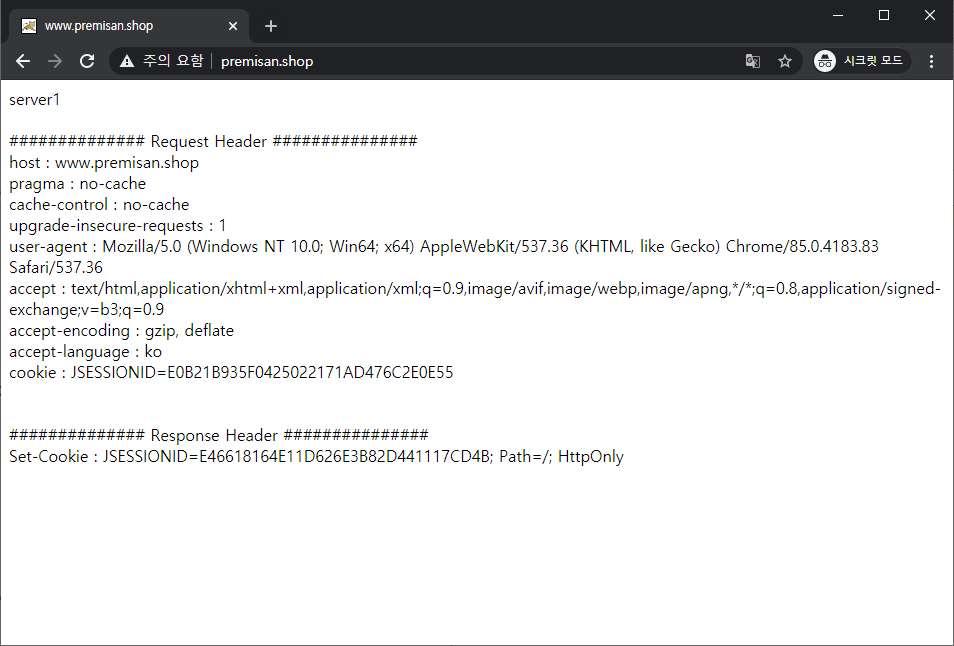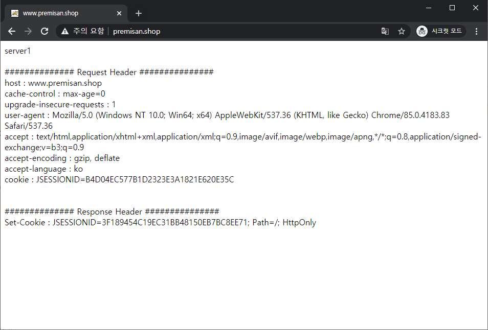 tomcat을 재시작합니다. 그리고 다시 테스트 도메인으로 접속해봅니다. 초기 접속 시 아래와 같이 새로운 쿠키값을 전달받습니다.
