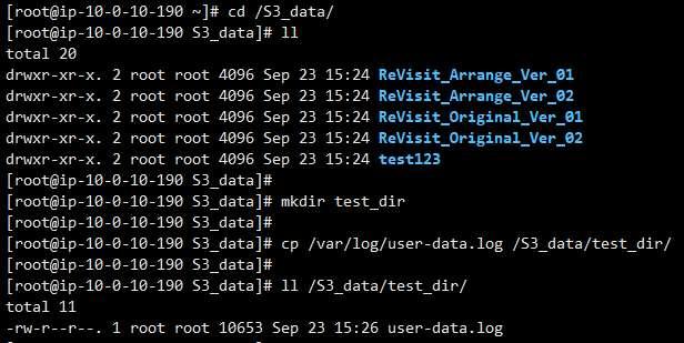 마운트한 디렉토리로 이동하여 디렉토리 및 파일 생성한 뒤, AWS 콘솔상에서 동일한 디렉토리 및 파일이 생성되었는지 확인합니다.