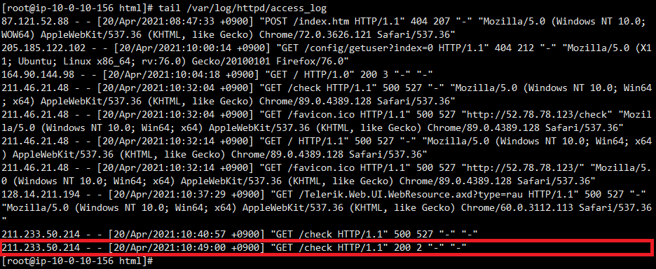 모니터링 대상 서버에서는 아래와 같이 웹로그가 찍히는 것을 확인할 수 있습니다.
