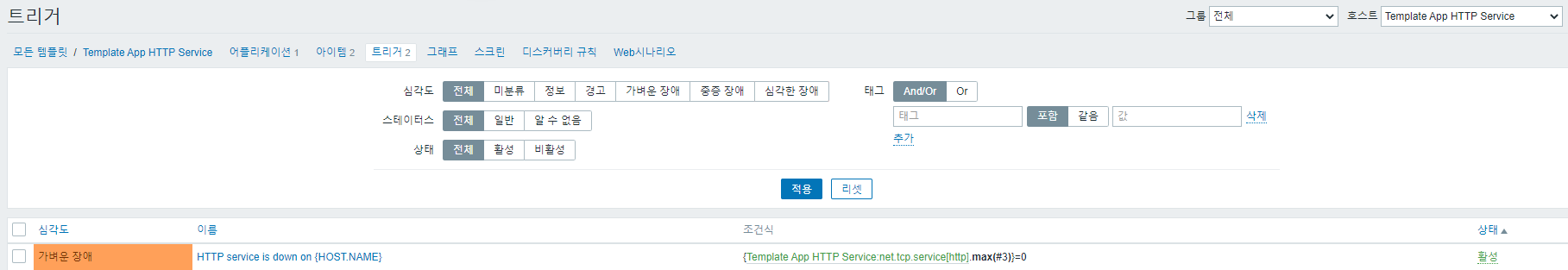 이제 웹 페이지에 대한 아이템 수집 설정은 완료되었으니 장애가 발생했을 경우 장애로 표시되도록 하기 위해 트리거를 설정합니다.
