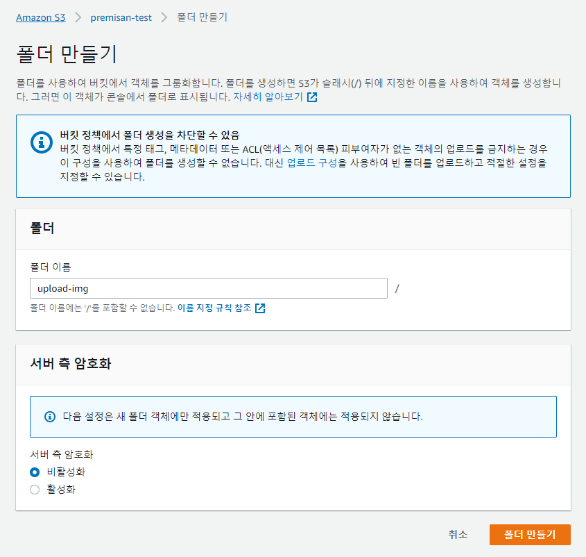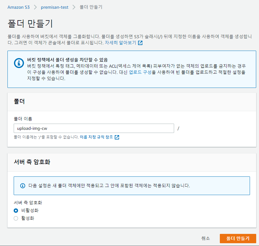 S3 에서 해당 버킷에 업로드용 폴더 "upload-img-cw/"를 생성해줍니다.
