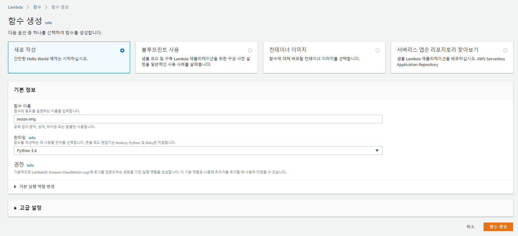 함수 이름은 구별하기 쉬운 이름으로 임의로 합니다. 런타임 환경은 계층의 버전 호환성에 맞게 설정합니다.