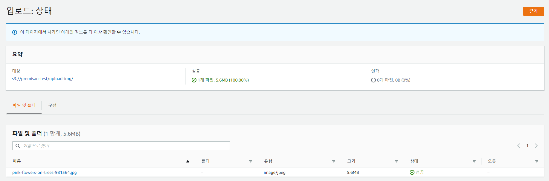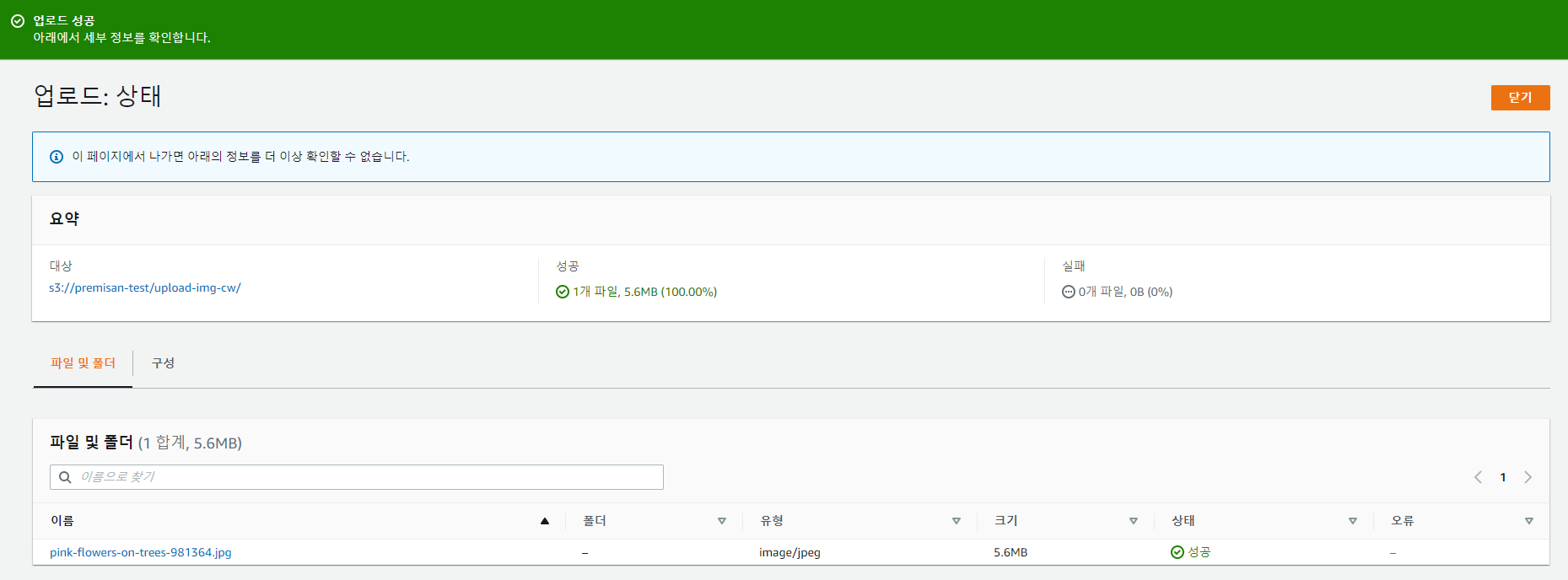 5. S3 버킷에 이미지 파일 업로드하여 작동 테스트