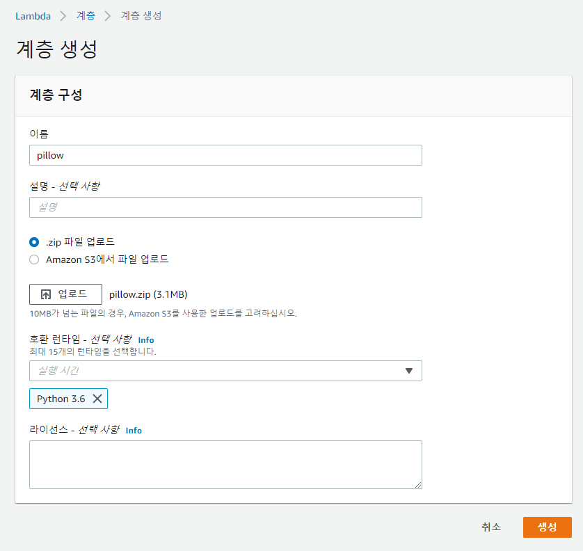이전 Serverless API 구성 관련 게시물에서도 여러번 언급한 것과 같이 Lambda 의 python 런타임이 모든 python 모듈을 포함하고 있지는 않기 때문에, 이미지 리사이징에 사용하는 Pillow 모듈을 다운로드하여 zip 파일 형태로 업로드, 람다 함수에 사용 가능한 계층의 형태로 만들어줍니다.
