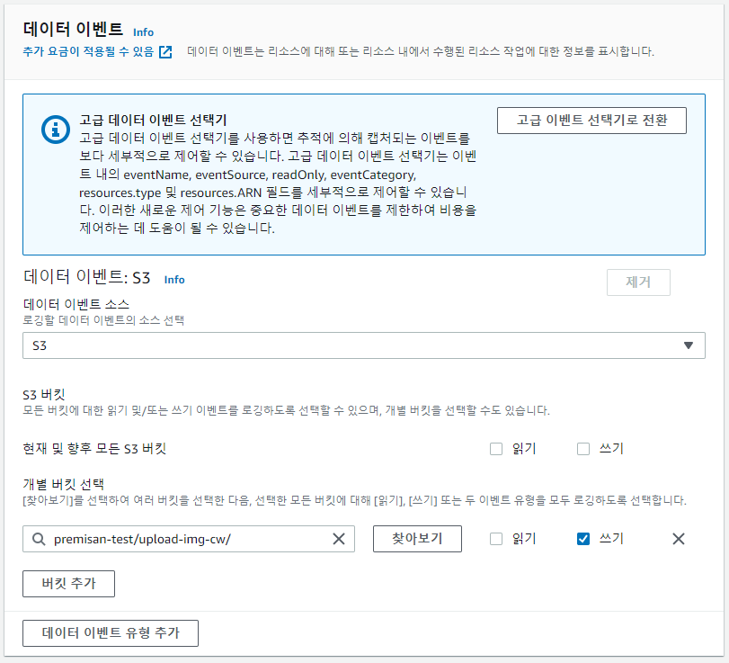 로그 이벤트 선택 단계에서 이벤트 유형은 "데이터 이벤트", 데이터 이벤트 소스는 "s3"로 선택합니다. 모든 버킷에 체크 해제 후 이벤트를 모니터링할 버킷 이름(premisan-test)과 폴더 이름(upload-img-cw)을 아래와 같이 구성해줍니다.
