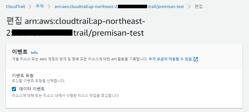 Cloudtrail 콘솔 -> 추적 -> 추적 생성 버튼을 눌러 추적을 생성합니다. CloudWatch Logs 옵션은 필수는 아니지만, 만약 함수가 실행되지 않거나 하는 경우 Cloudtrail 에서 넘어온 이벤트를 확인하기 위해 편의상 활성화합니다.