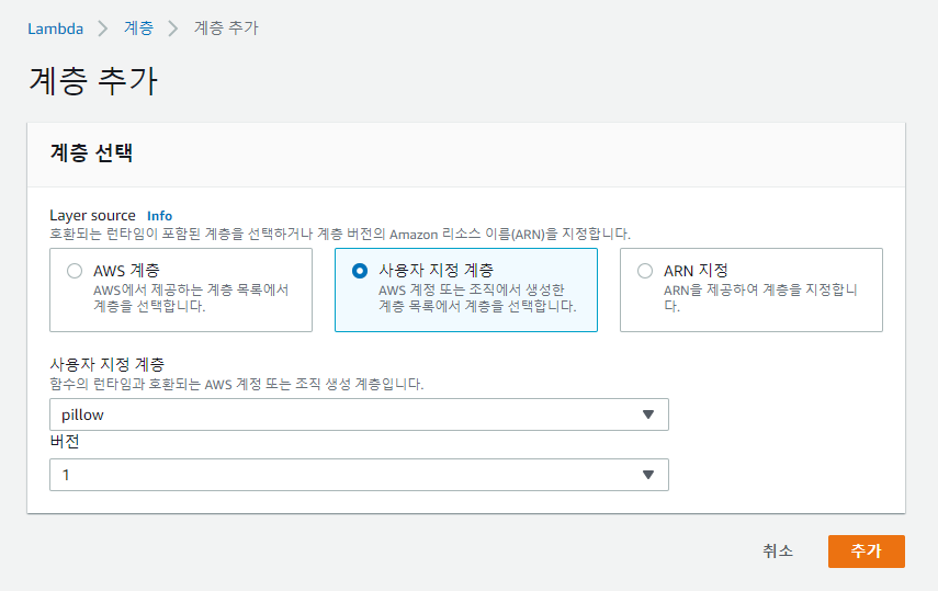 이전 단계에서 생성한 이미지 리사이징 모듈 pillow 계층을 함수에 추가해줍니다.